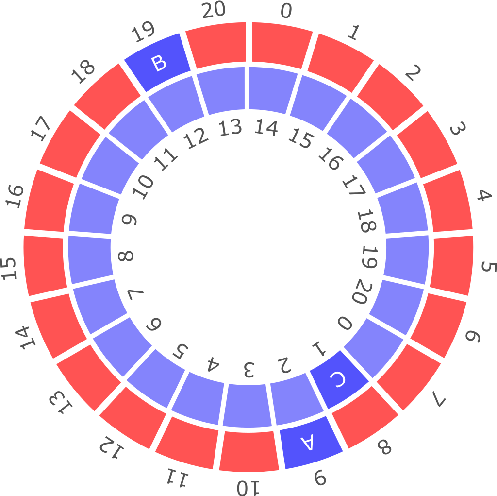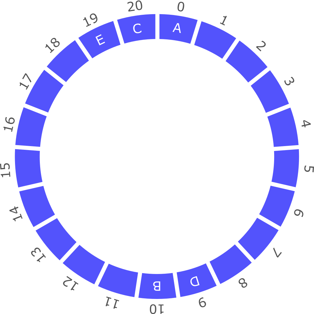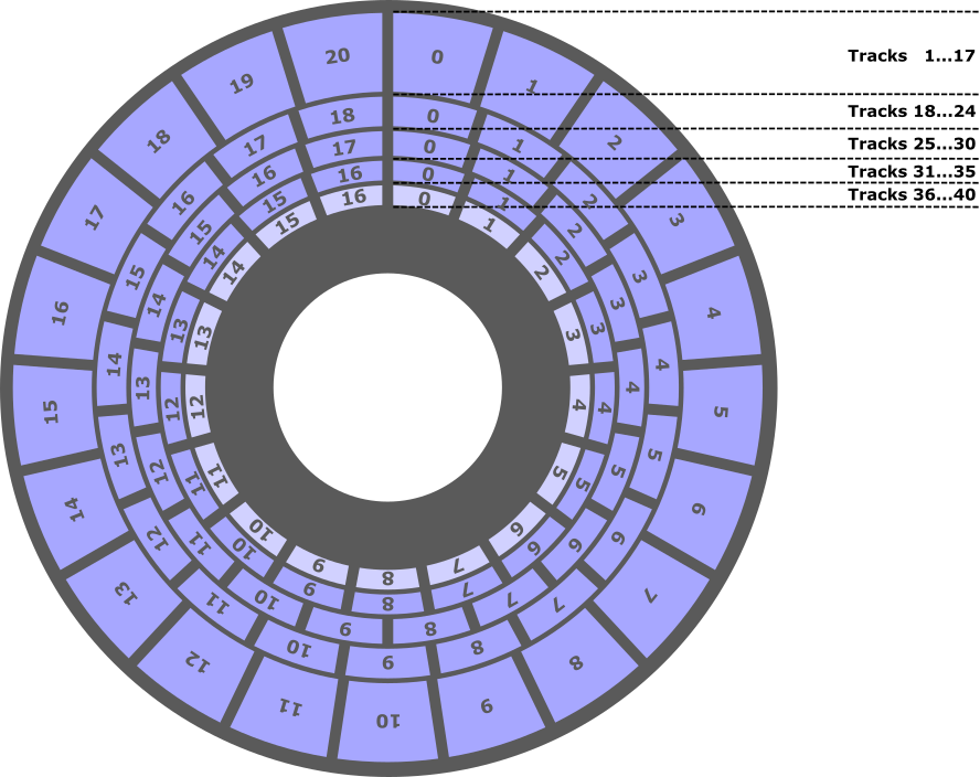 Schematic of a 5,25" floppy disk with the different speed zones: for simplification, the sectors are perfectly aligned here, which is usually not the case on real hardware because of the way the disk format routine works.
